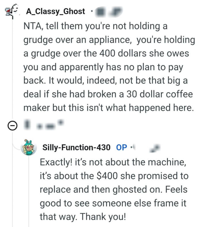 When that doesn’t happen, small issues can quickly turn into lingering tension. That’s exactly the situation the OP found herself in. As a passionate coffee lover, the OP had saved up to buy a $400 Breville espresso machine—one of her few prized possessions.