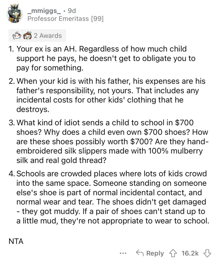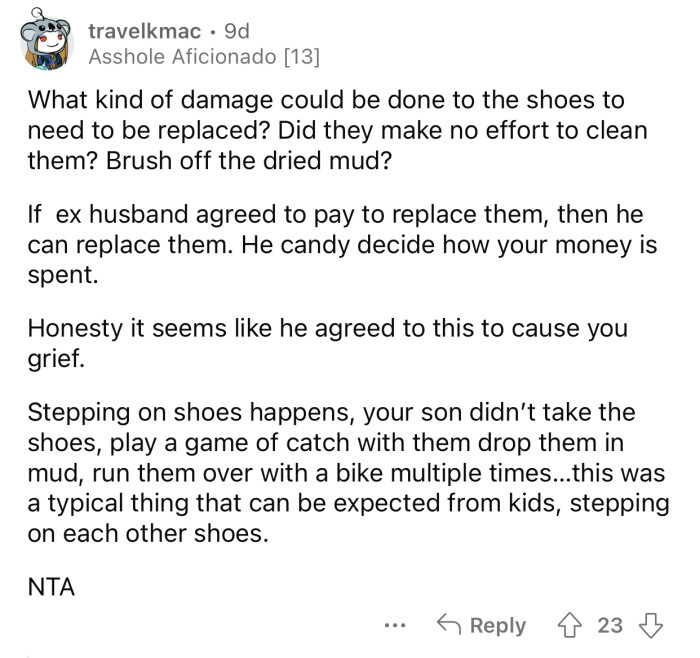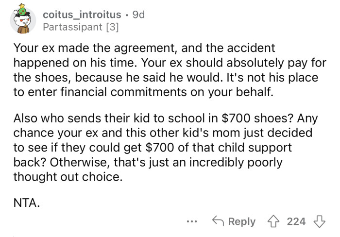 Reddit: r/AmItheA**holeOP's ex wanted to set a good example by agreeing to pay for the shoes.