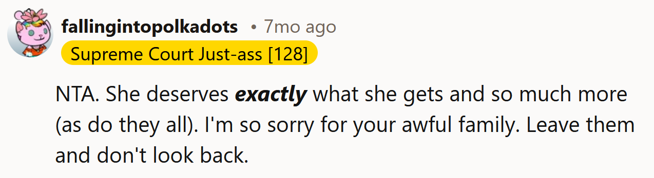 The Redditor slammed the door, packed her things, and left. She hasn't spoken to any of them since.