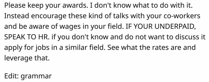In one form or another, their conversation while working led to a discussion about salary. The bold new employee asked how much the trainer makes per hour, given his greater experience.