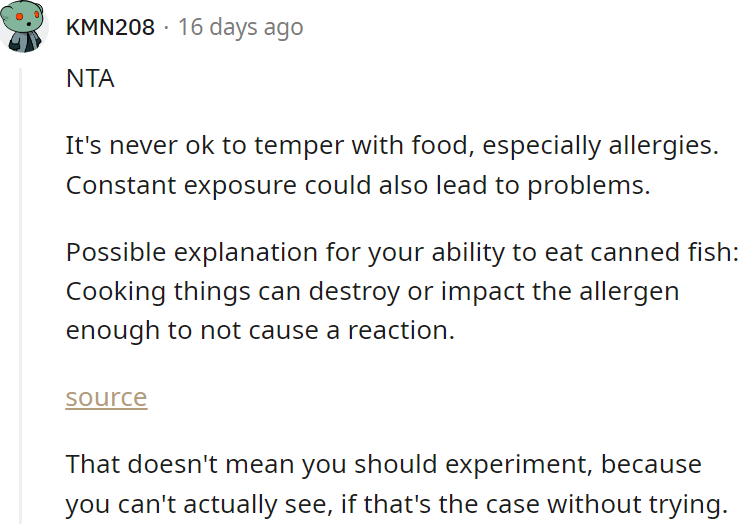 Our narrator (Original Poster) has been on a lifelong journey battling a finned fish allergy. It is non-deadly but severe and a little tricky. There is one peculiar exception – canned tuna.