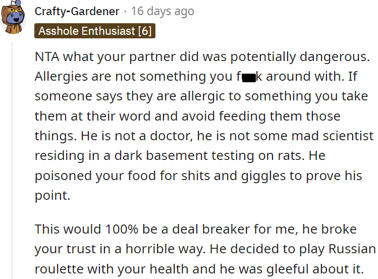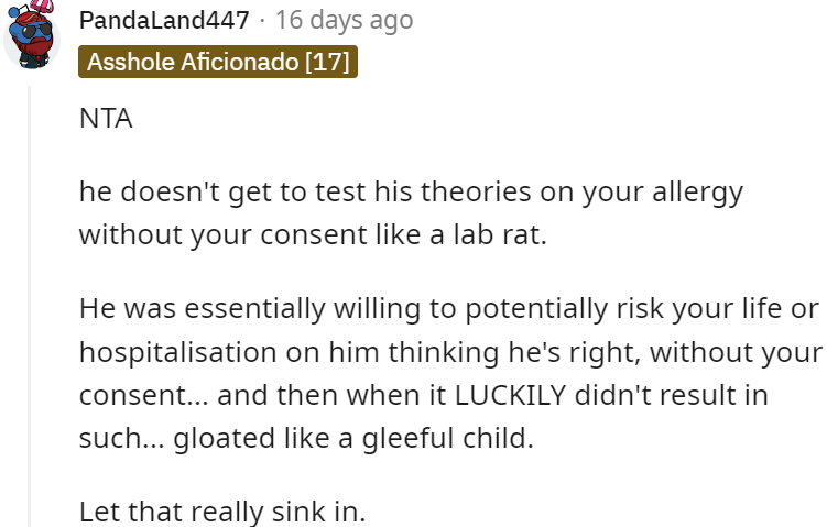 Redditors were shocked that the one person supposed to care about OP would risk his health due to some misguided experiment. It was unanimous—the boyfriend’s actions were irresponsible and selfish and showed a lack of respect for OP’s well-being.