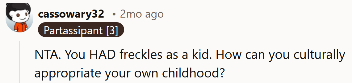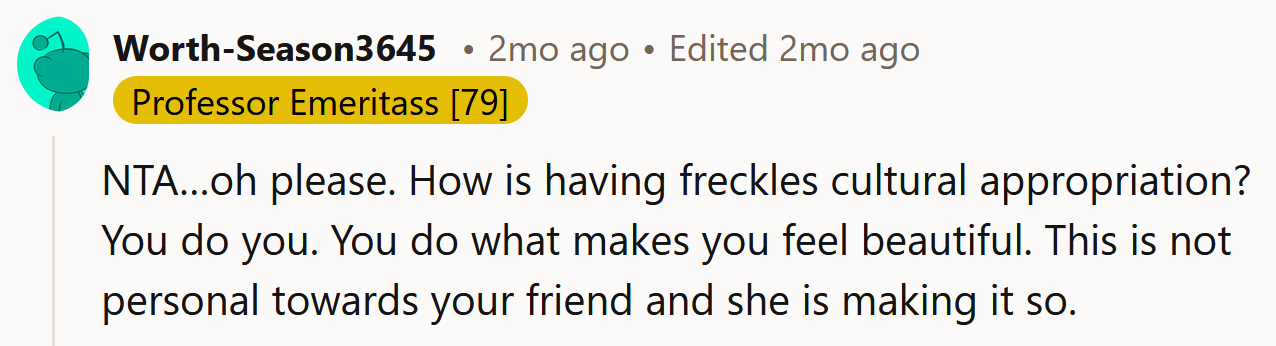 In this scenario, the Redditor's choice to wear fake freckles could be seen as a form of self-expression that deserves respect and understanding rather than judgment.