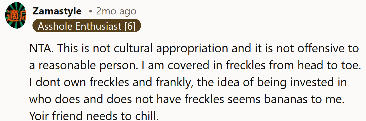 So, what are your thoughts on this situation? Do you think the OP was being offensive by wearing fake freckles, or was her friend being entirely unreasonable here?