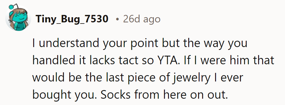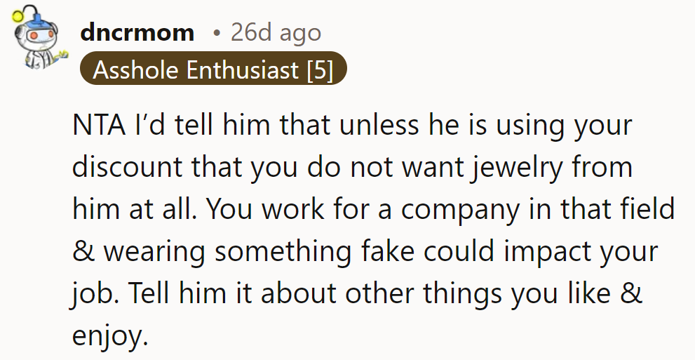This situation underscores the delicate balance in gift-giving between thoughtfulness and the suitability of the gift itself. The woman's expertise in jewelry made her particularly sensitive to the authenticity of the pieces she received.