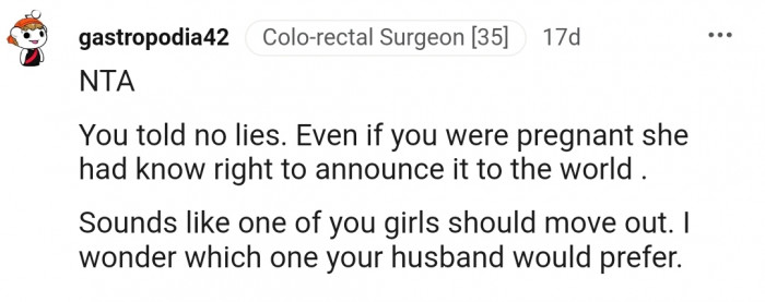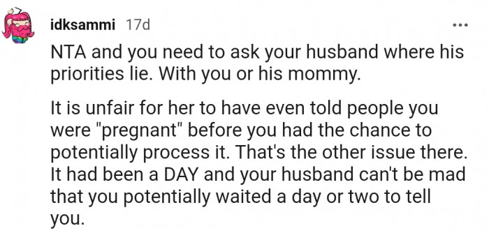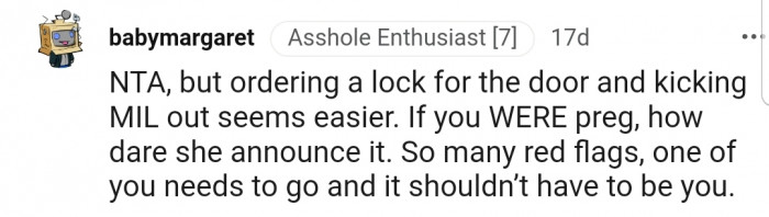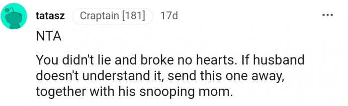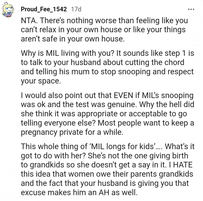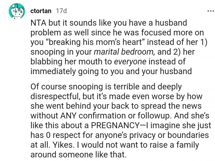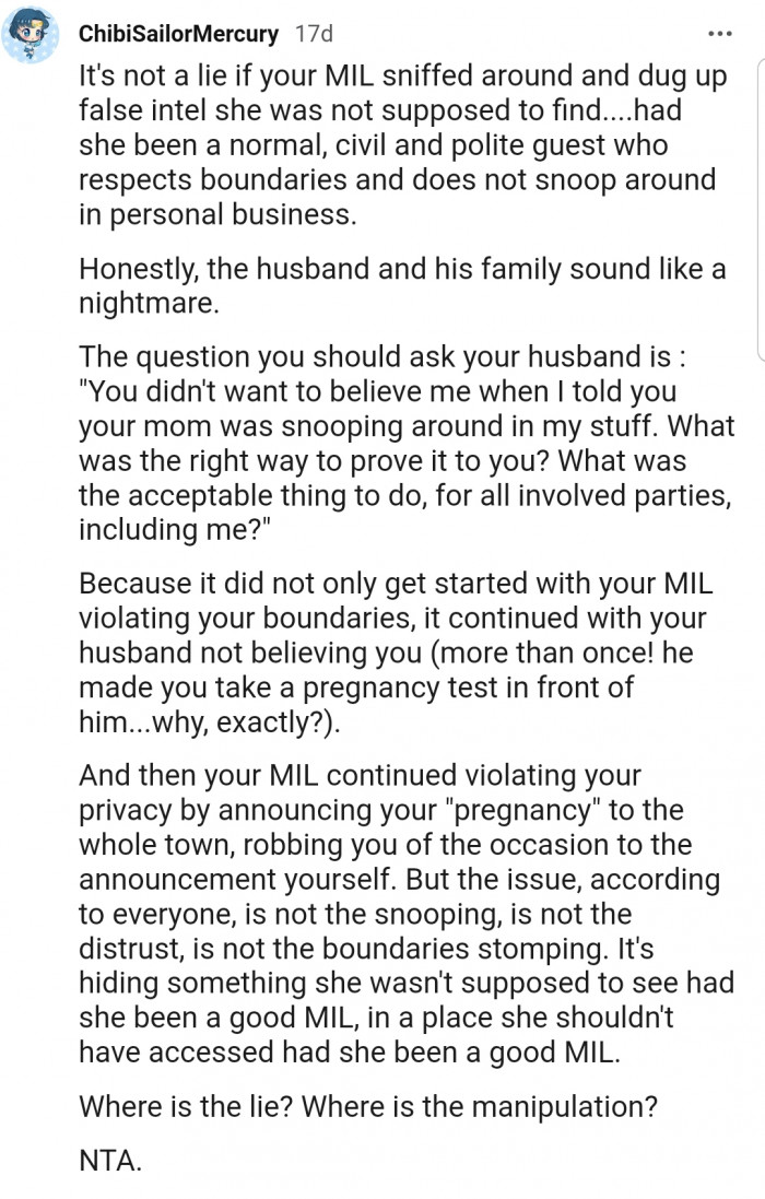 The next day, OP and her husband were able to piece the puzzle together, revealing that her mother-in-law was the one snooping around. However, tricking the entire family into believing she was pregnant wasn't something that OP's husband was happy about