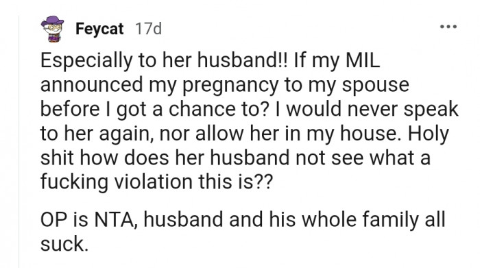 "If my mother-in-law announced my pregnancy to my spouse before I got a chance to, I would never speak to her again, nor allow her in my house."