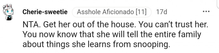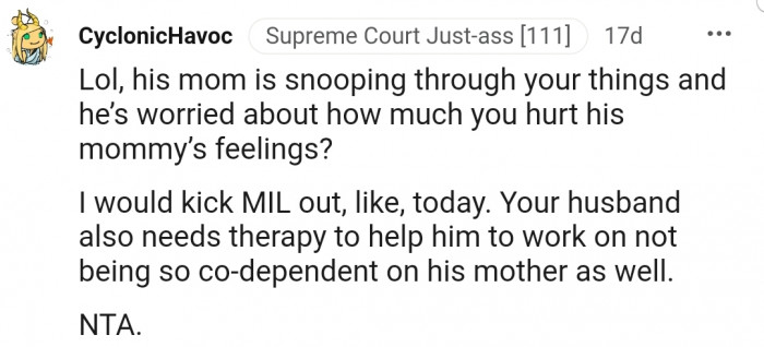 OP has the full support of the Reddit community. The commenters stated that OP’s mother-in-law was wrong for snooping around her items and that her husband should be more supportive.