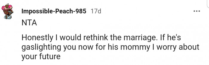 "If he's gaslighting you now for his mommy, I worry about your future."