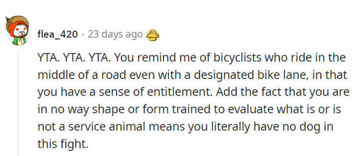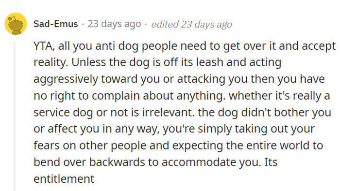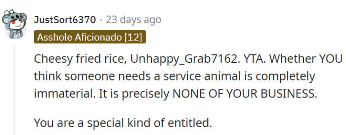 RedditOP then gets called an a-hole for questioning whether the service dog was real. She then consults a friend about the situation, who in turn tells her that she is in the wrong—but she refuses to back down and admit it.