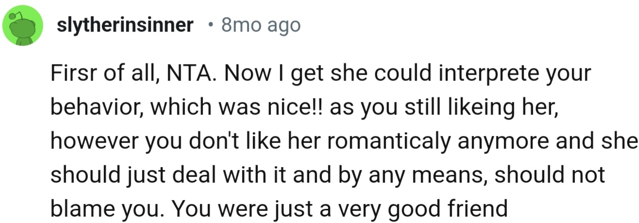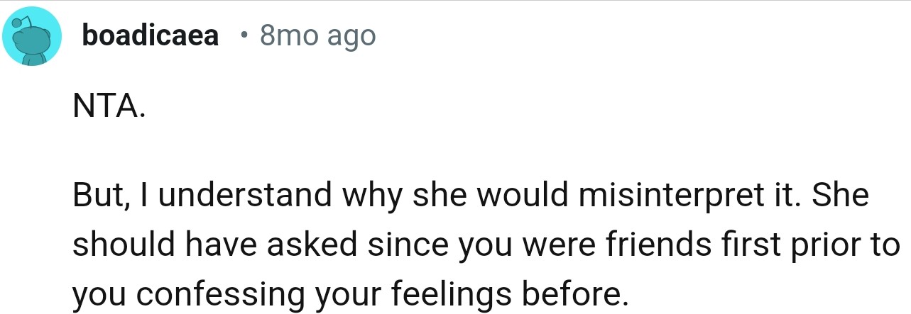 "She should have asked since you were friends first prior to you confessing your feelings."