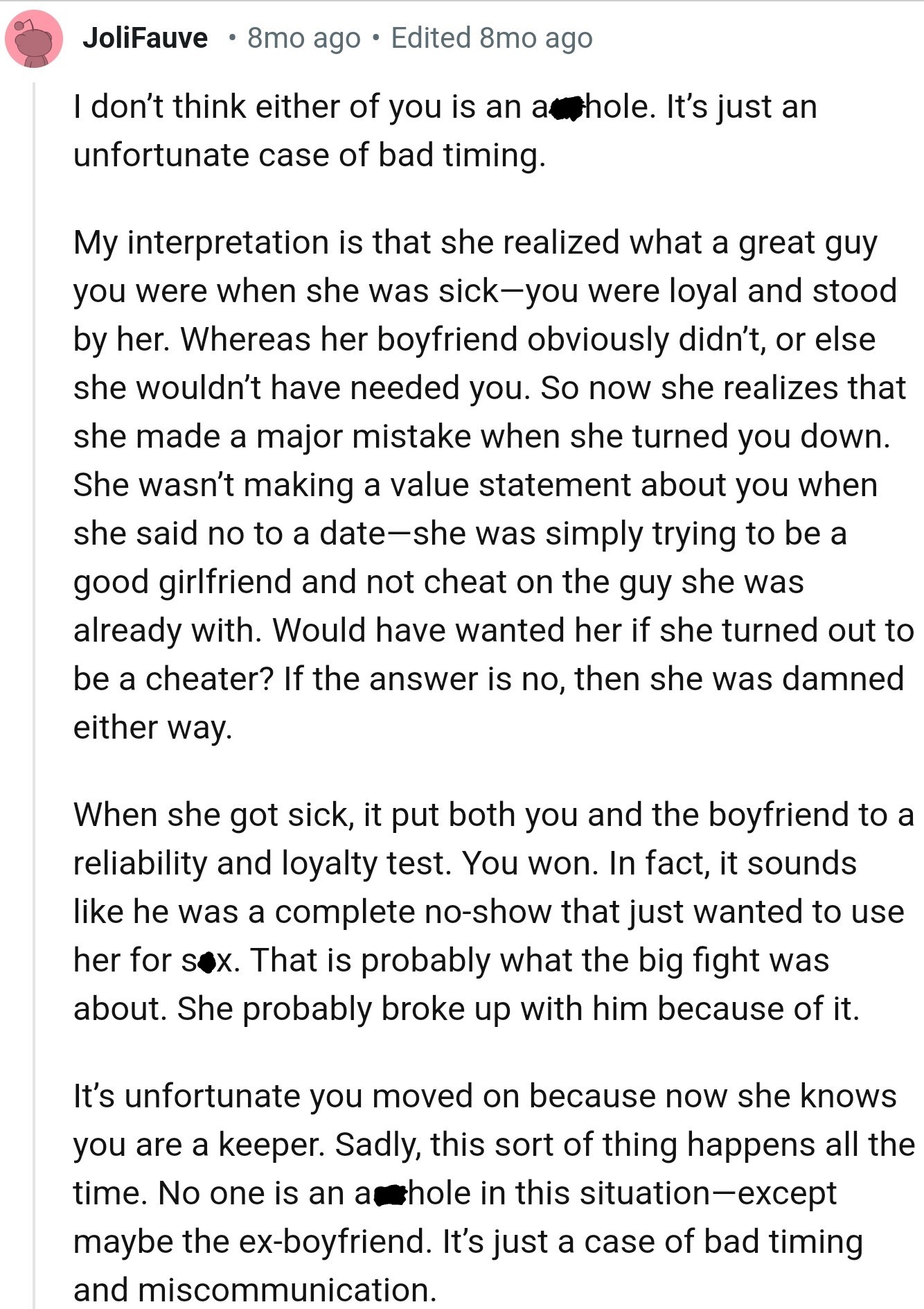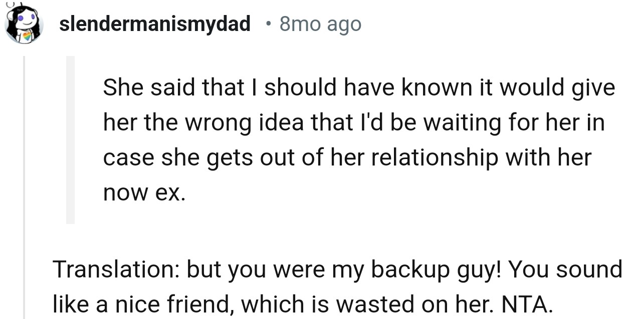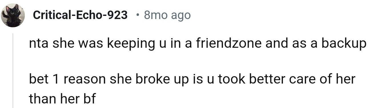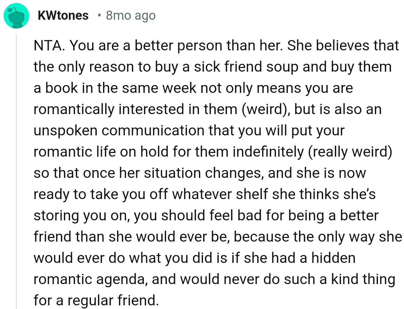 Mind you, he kept things strictly platonic. No romantic gestures, just pure, friendly care. This is why he found it very shocking when his friend asked him out the following week after her relationship hit the rocks.