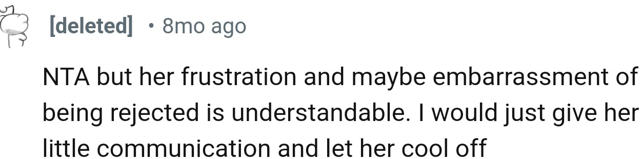 "Her frustration and maybe embarrassment of being rejected is understandable."