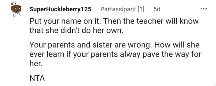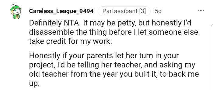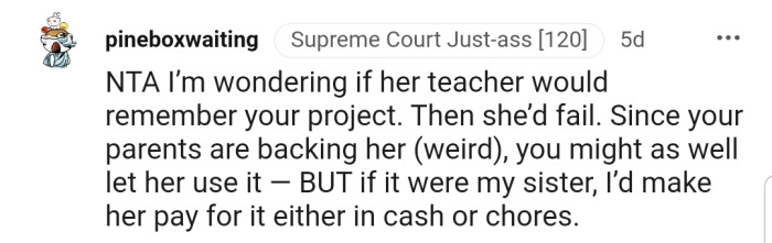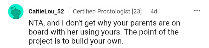 The Reddit community believes that OP is NTA in any way or form. In fact, everyone is baffled by OP’s parents' reaction to his demand that his project not be used by his younger sister.
