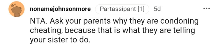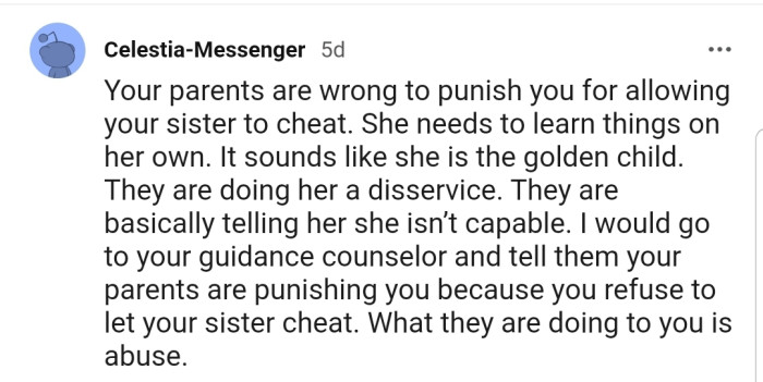 "I would go to your guidance counselor and tell them your parents are punishing you because you refuse to let your sister cheat."