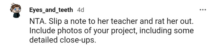 Some people gave him advice on how to prevent his project from being used behind his back, while others advised him to allow her to use it but report the incident to her teacher.