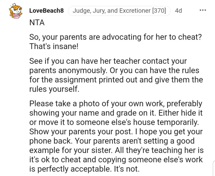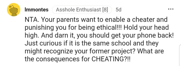 "Your parents want to enable a cheater and are punishing you for being ethical! Hold your head high."