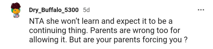 "NTA...She won’t learn and will expect it to be a continuous thing."