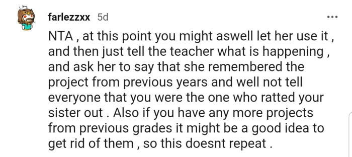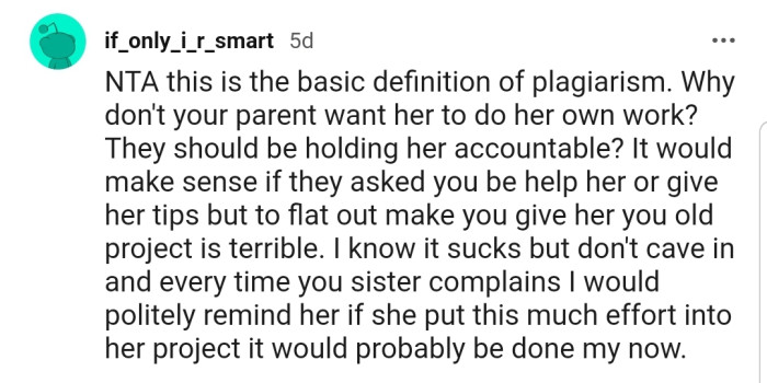 Reddit.comOP is standing his ground despite pressure from his parents to allow his sister to use his old project. In addition, he's taking extra steps to ensure that she doesn't go behind his back to use his project. Mom seems to be on his side now, but Dad is still insisting.