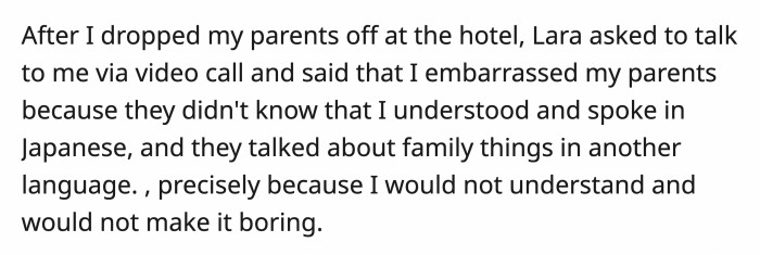 Lara told OP that she embarrassed her parents when she didn't disclose that she spoke Japanese. She said her parents spoke of family matters in Japanese, thinking OP couldn't understand them.
