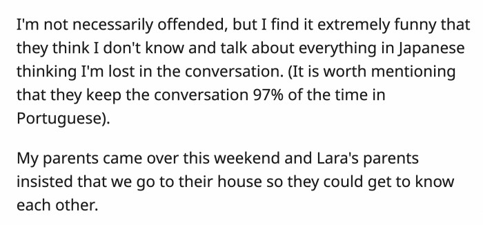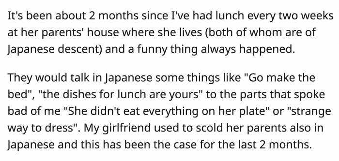 They would also criticize OP in Japanese, not knowing she was perfectly fluent. Lara's parents would talk about OP's manner of dressing and even how much she ate; for her part, Lara scolded her parents in Japanese to stop talking badly about OP.