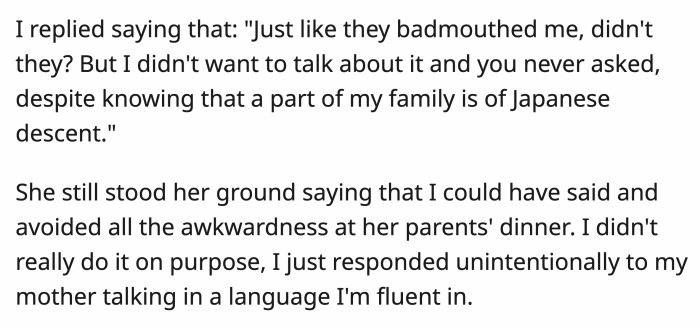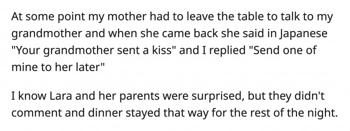 Lara doubled down and said OP could have mentioned it and avoided the awkwardness during their dinner. OP said she didn't speak Japanese on purpose, as she was simply responding to her mother's update.