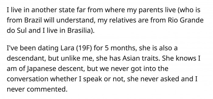 This 18-year-old clearly had the same idea when she asked a Reddit community for guidance about her relationship. OP is Brazilian-Japanese, but because of her last name, her Japanese ancestry is not obvious.