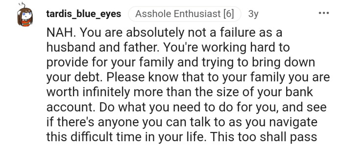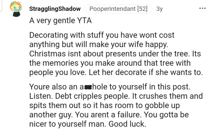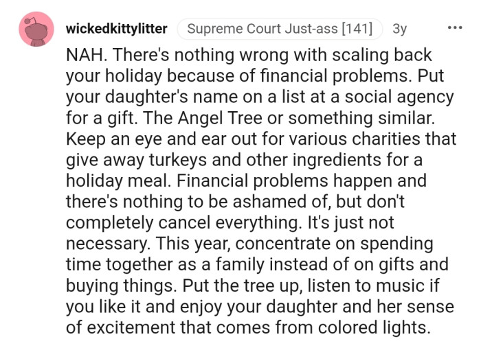 As good as this plan seems, he questions whether he would be judged for making such a decision. Is he an a**hole for considering cutting out the cherished traditions that define the holiday season, or is it a necessary sacrifice to overcome his financial turmoil?