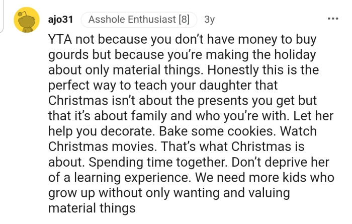 "YTA Because You’re Making the Holiday About Only Material Things."