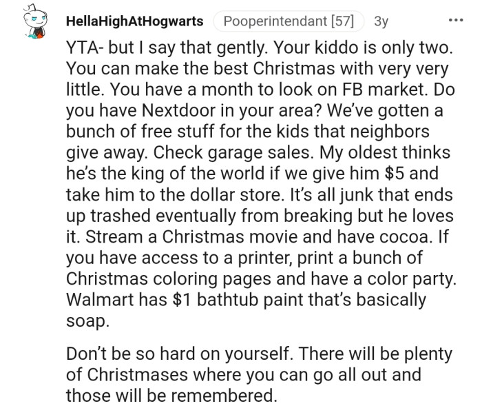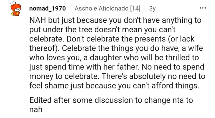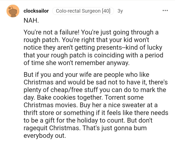 The Reddit community has shown OP overwhelming love. The commenters have reiterated that despite his financial troubles, there is no reason for him to cancel the Christmas celebration.