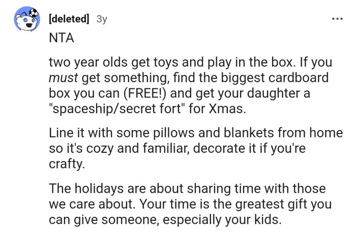 As one Redditor said, "Christmas isn't about presents under the tree. It's the memories you make around that tree with people you love."