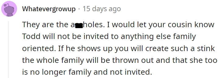 "I would let your cousin know Todd will not be invited to anything else family-oriented."