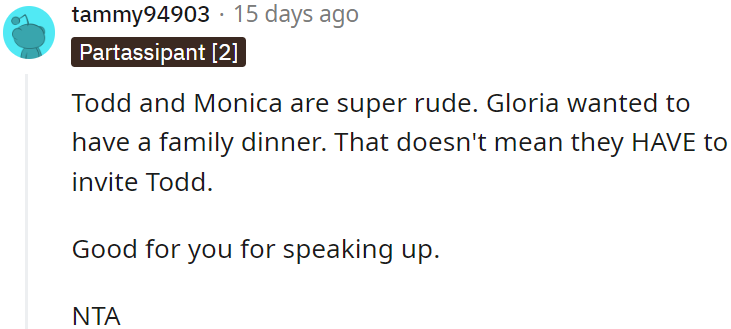 Although Gloria settled the bill, it was good to know that OP confronted Todd and made him aware of his rude behavior. Unfortunately, Todd refused to acknowledge any wrongdoing. Who knows, this might get him blacklisted from any family gathering in the future.