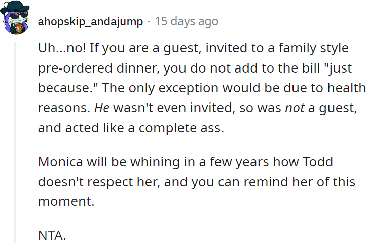OP’s cousin, Monica, brought her fiancée, Todd, who was not initially invited. Two dinner sets were ordered, and everyone got a generous serving.