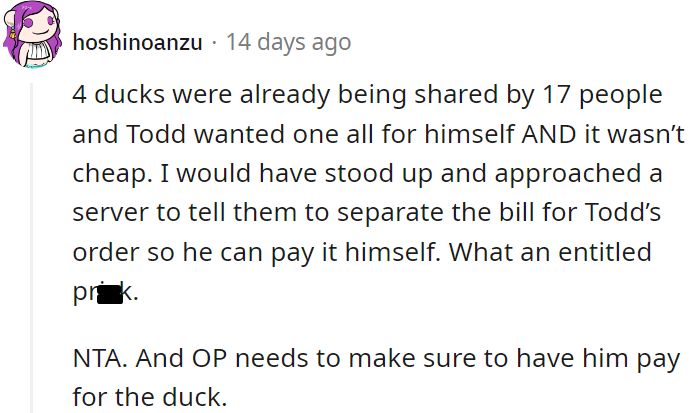 "I would have stood up and approached a server to tell them to separate the bill for Todd’s order so he can pay it himself."