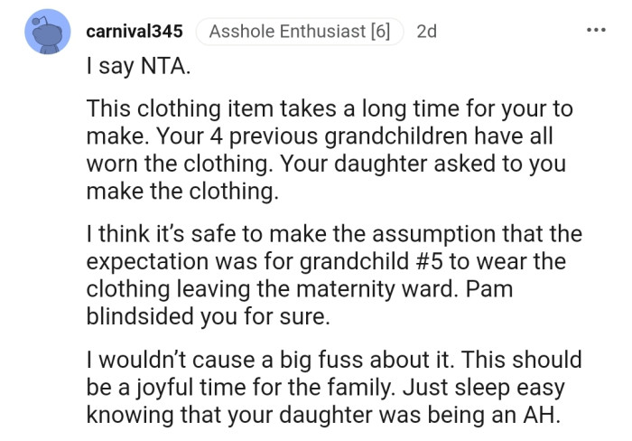 In a world filled with fleeting trends and disposable fashion, there are still those who create with love and care, cherishing the beauty of handmade garments. Our narrator (Original Poster), a doting grandparent with a heart full of affection, embarked on a tradition for their grandchildren that held a special place in their hearts.