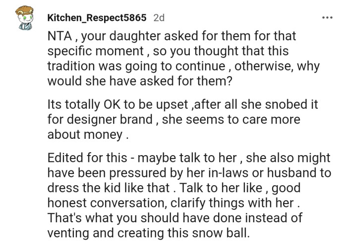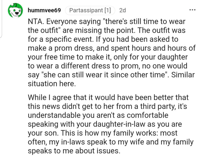 Yet, when the moment arrived, a wave of disappointment crashed over OP. Their handmade masterpiece was replaced with an extravagant outfit from their daughter's in-laws.