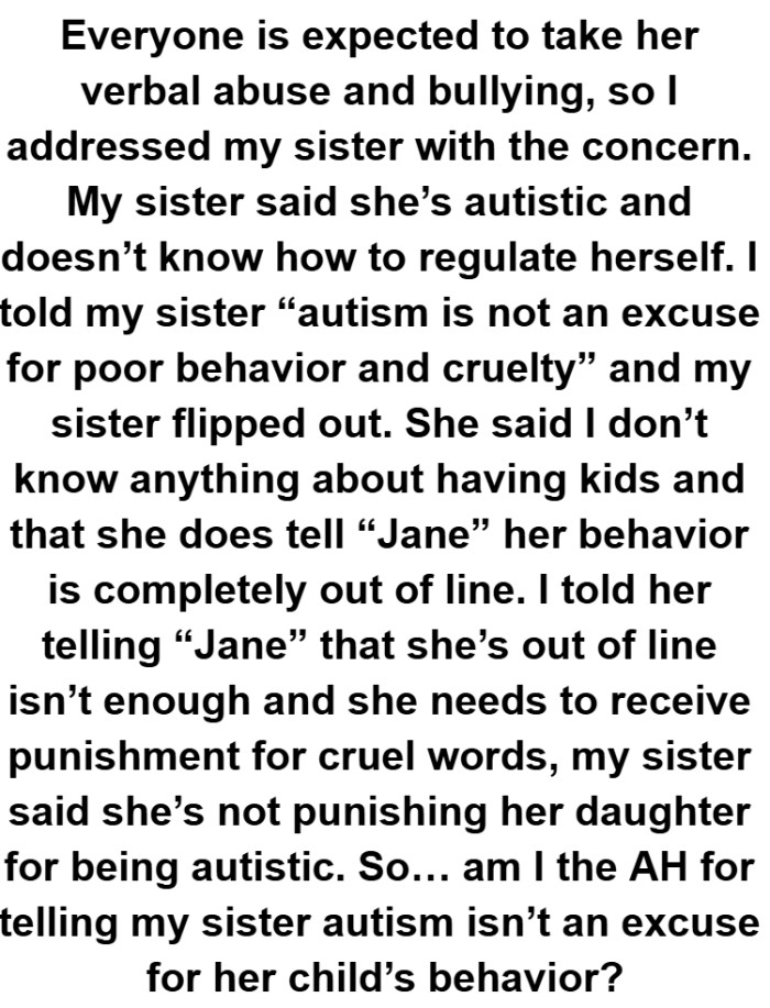1. The action they should be judged is me telling my sister her child’s autism isn’t an excuse for cruel/ bad behavior and 2. I might be the AH because I suggested punishing an autistic kid.And the comments rolls in...