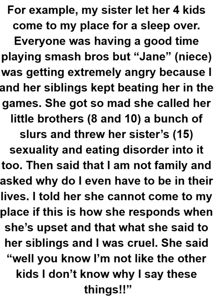 What began as a single confrontation quickly turned into a deeper disagreement about parenting, boundaries and responsibility. The aunt believed kindness should never mean accepting cruelty, while her sister saw the situation through the lens of protecting a child who struggles with emotional regulation.