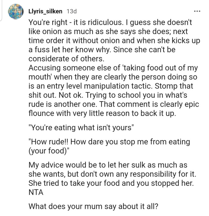 OP stopped her sister from eating it, explaining that the slice was for her and her mother, and that eating it would force them to eat from the portion with onions. This upset her sister, who accused OP of being rude for "stealing food from her mouth."