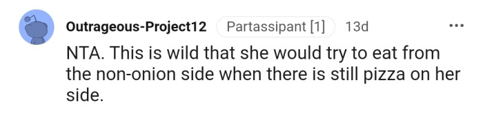 "This is wild that she would try to eat from the non-onion side when there is still pizza on her side."