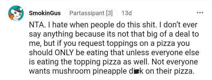 "NTA...If you request toppings on a pizza, you should ONLY be eating that unless everyone else is eating the topping pizza as well."