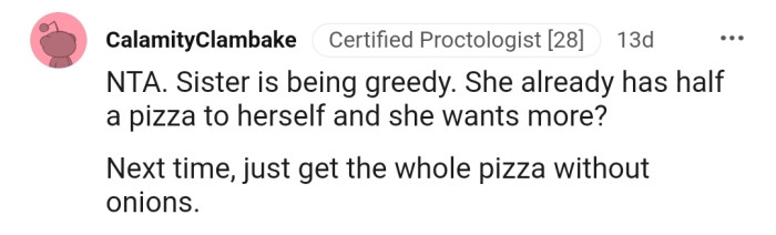 When the pizza arrived, they all stuck to eating from their preferred side, but OP’s sister reached out to take a slice from the onion-free half.