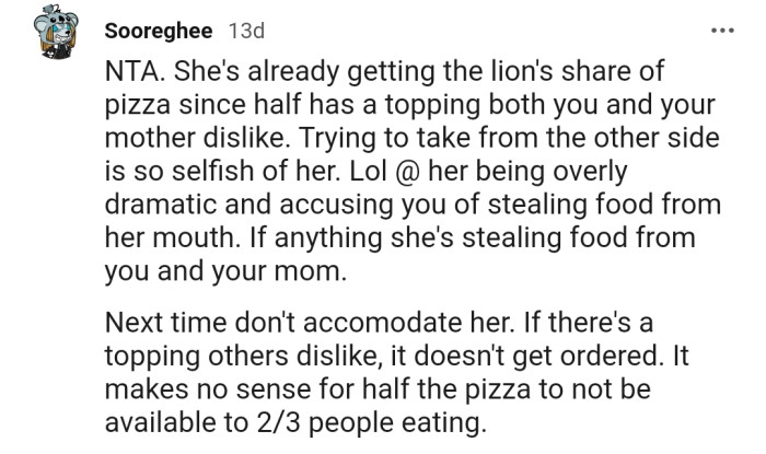 "She's already getting the lion's share of pizza...Trying to take from the other side is so selfish of her."