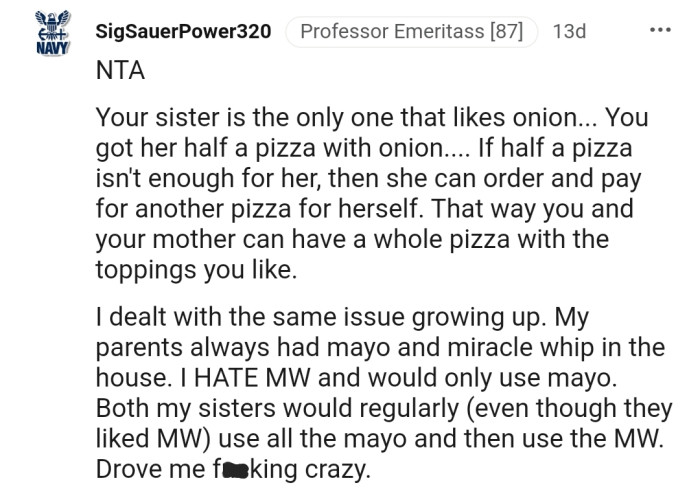 OP shared that she and her mother hate onions on pizza, but her sister likes them. So, when they ordered pizza one day, she opted to have one half of the pizza come without onions and the other half with onions.