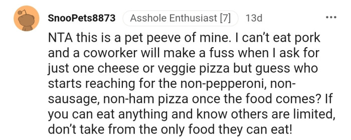 "NTA...If you can eat anything and know others are limited, don’t take from the only food they can eat!"