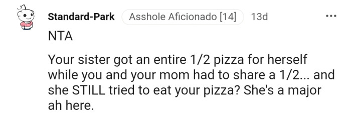 "Your sister got an entire 1/2 pizza for herself while you and your mom had to share a 1/2... and she STILL tried to eat your pizza?"