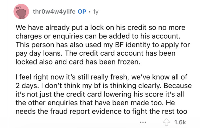 Choosing a life partner is a difficult task that most people find challenging. Even when you think you have found "the one," people change over time and can also be excellent at pretending. According to Dr. William Doherty, a family therapist, "Relationships are dynamic and require ongoing effort and communication to navigate the complexities of trust and vulnerability." Some life events end up uncovering people's true nature or at least help you understand them much better. After that, you can either take a gamble and hope for the best or consider it a wake-up call to move on and free yourself from that person. As Dr. Doherty emphasizes, "When trust is broken, it can be a pivotal moment in a relationship." Either way, humans are complicated creatures, and you can never be certain of their intentions. All you can do is wait and see what life throws your way. A Redditor who goes by the username u/thr0w4w4ylife made a post on the r/AmItheA**hole subreddit, where she explained how she recently discovered that one of her boyfriend's family members has been using his credit card, ruining his credit as a result. The user wanted her boyfriend to report his family member for fraud, but he decided to ignore the problem entirely. The r/AmItheA**hole community had a variety of reactions to the user's post. Scroll down to check out the full Reddit post, and scroll a little further to read the comments from the original post.