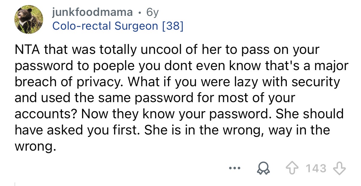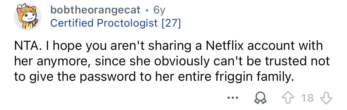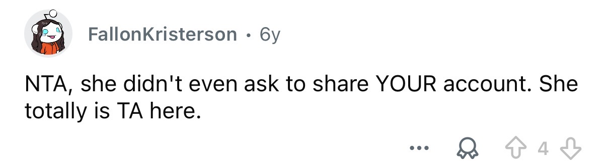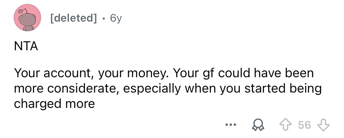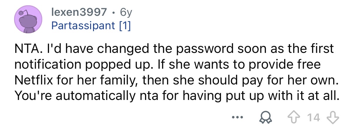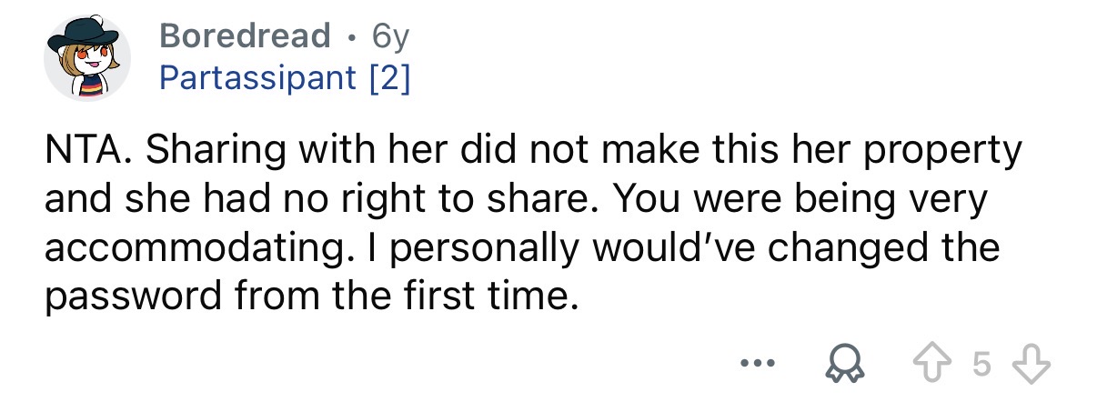 He didn’t think asking to be notified before new people used his paid account was unreasonable. In fact, he would’ve been just as upset if the same thing had happened with his own siblings or close friends.