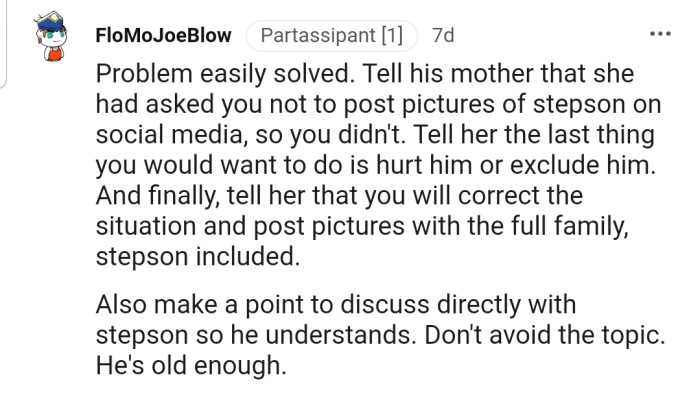 "Tell his mother that she had asked you not to post pictures of the stepson on social media, so you didn't."